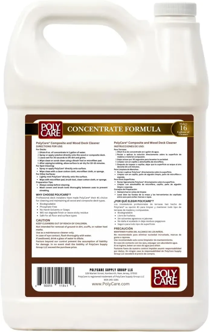 1 Gallon Light, fresh scented Safe effective cleaner for composite and wood decks Formulated to clean effectively, without leaving any soapy haze or residue on the surface Unique detergent formula which cleans effectively without rinsing Leaves only the beauty of fine surfaces, not a lingering odor and never a residue
